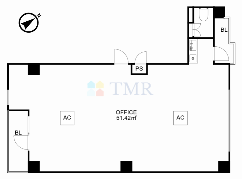 賃室は15,5坪とご利用の目安は5名前後の広さです。個人事務所などにいかがでしょうか。