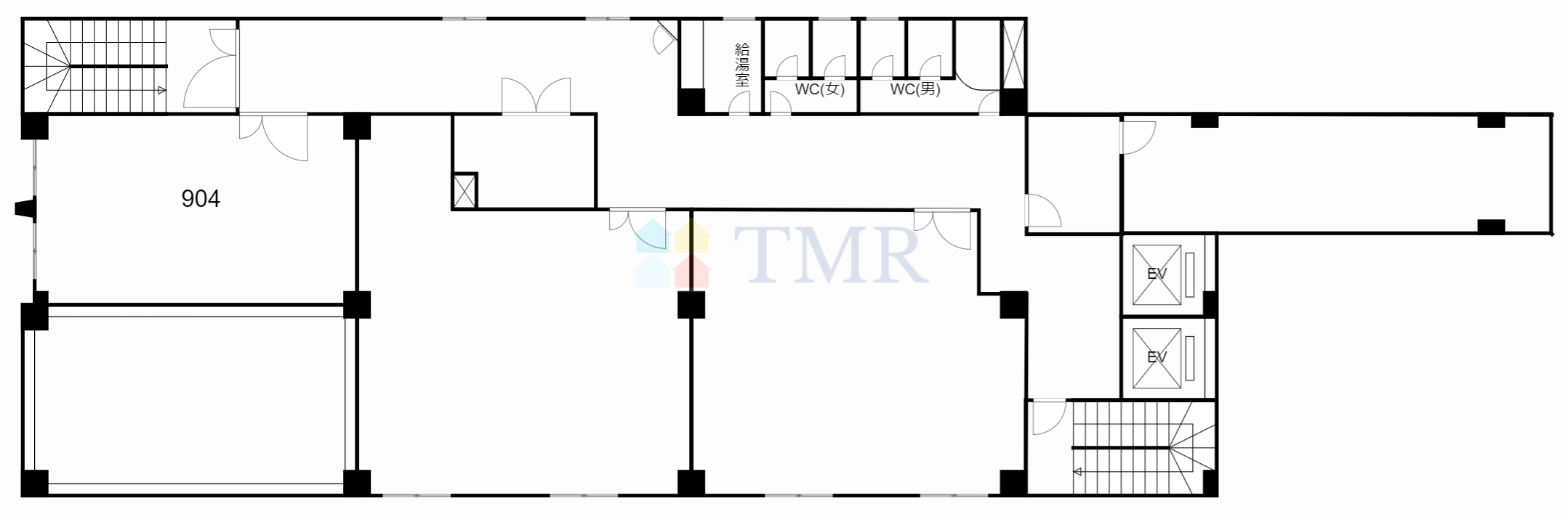建物設備はエレベーターが2基あるので、混雑する時間帯もスムーズにご利用いただけます。セキュリティ面は機械警備を完備。9階の賃室904号室は約41.35㎡、天井高は2,400㎜、床仕様はタイルカーペット。室内設備には個別空調、共用部には給湯室と男女別のトイレがあります。