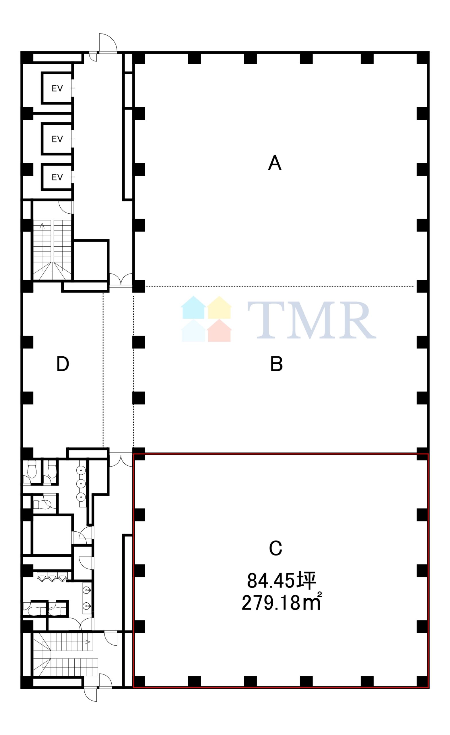 今回募集する地上3階C室は、専有面積279.18平方メートル(約84.5坪)の広さを有します。開放感のある空間は、多様なオフィスレイアウトに対応可能です。執務スペースの他に、会議室や応接室、リフレッシュスペースなどを設けることも検討できるでしょう。業務内容や企業文化に合わせて、空間をデザインできる点が特徴です。快適な執務環境を構築するための基盤が整っています。