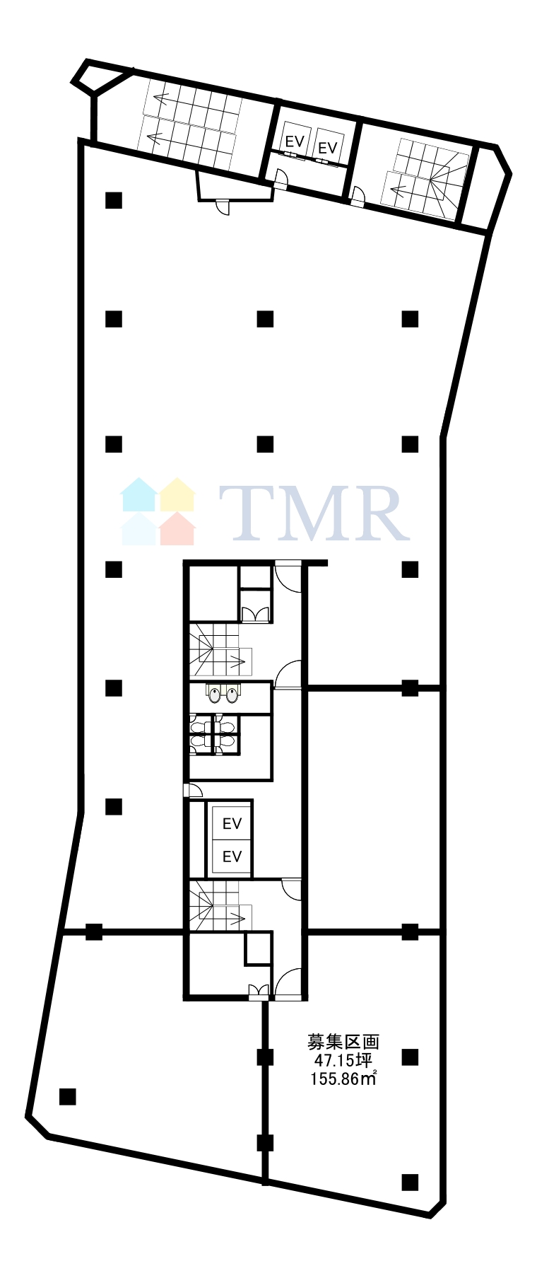 今回募集している地上2階の区画は、専有面積155.86平方メートル(約47.1坪)を確保しており、オフィスとして利用しやすい広さです。レイアウトの自由度が高い空間で、企業様の事業規模や用途に応じた執務スペースの設計が可能です。即時入居が可能となっており、スピーディーな事業開始にご検討いただけます。